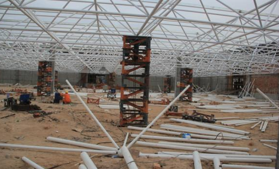 5)总体晋职法:此步履多使用在周边支护以及有多点支护的网架结构,可采取平板升降机、液压千斤顶等小型机具作业安国施工;